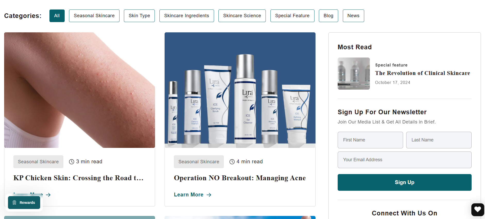 Lira Clinical, a $50M woman-owned D2C & B2B global skincare company, needed a new website with fresh branding, updated copy, and original content creation. It was essential to sales that we create an online shopping experience that matched the informative and personalized in-store customer experience. The content organization focused on Lira's six skincare lines, the skin conditions they address, and a brief customer quiz that delivers the best solution and suggested products, along with night, day, and weekly regimens. Shoppers can easily purchase the right products without making time-consuming and costly customer service calls or unnecessary returns. On the homepage, we featured before-and-after photos, reviews from loyal customers, links to blog posts, and Lira's Instagram feed.