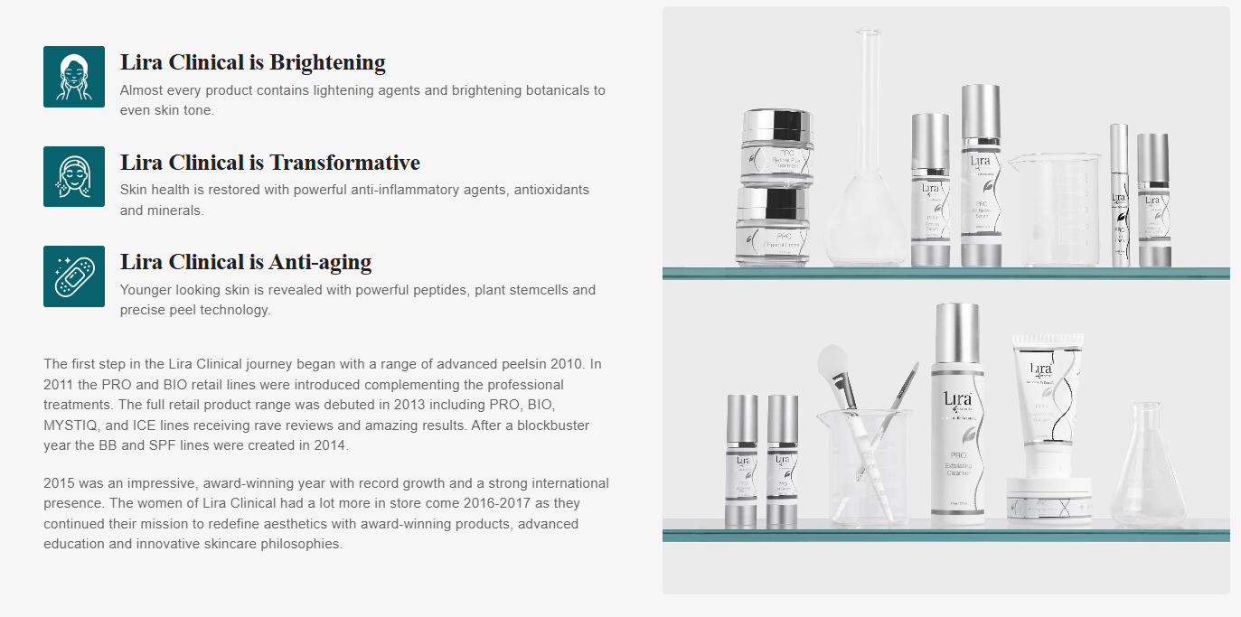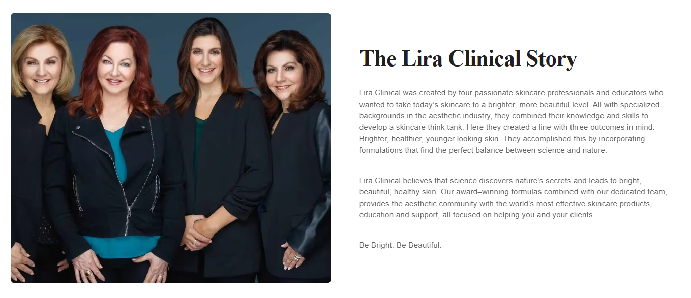 Lira Clinical, a $50M woman-owned D2C & B2B global skincare company created by four passionate skincare professionals and educators, is taking skincare to a brighter, more beautiful level. All with specialized backgrounds in the aesthetic industry, they incorporated formulations to find the perfect balance between science and nature, resulting in a line of products that support brighter, healthier, younger-looking skin. Lira's award–winning formulas are paired with a dedicated team of industry experts to create a global aesthetic community featuring highly effective skincare products, targeted education, and white-glove support. Be Bright. Be Beautiful.